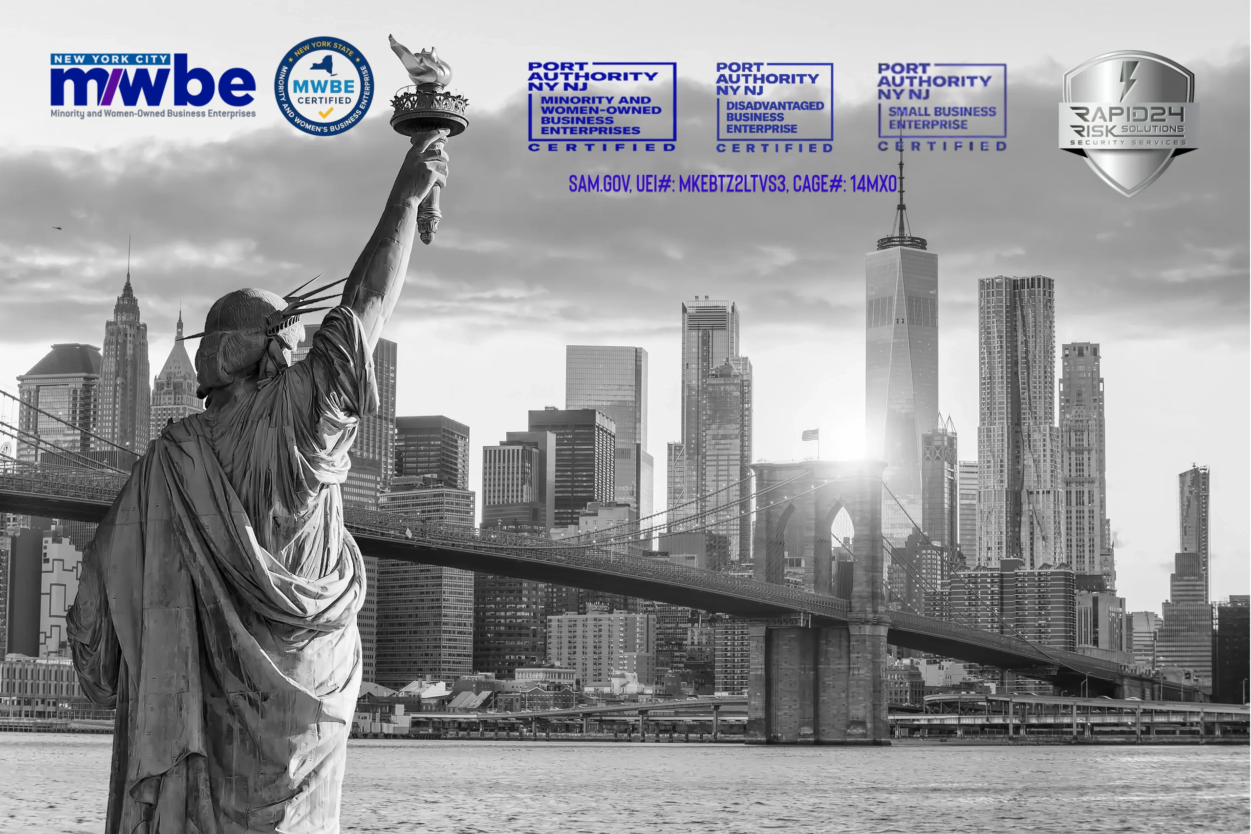 Rapid24 Risk Solutions, LLC is M/WBE certified with NYC, NYS, Port Authority of NY & NJ, DBE, and SBE with Port Authority of NY & NJ, registered with SAM.gov, UEI: MKEBTZ2LTVS3, CAGE#: 14MX0. NAICS Code: 561612, Security Guards and Patrol Services, NIGP Code: 918, Consulting, 990, Security, Fire and Emergency Services.